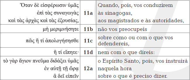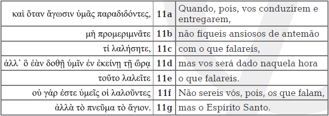 Enquanto o trecho correspondente no Evangelho segundoMateus insiste na presença quádrupla do verbo «falar» (veremMt 10,19b.c.20a.b), o Evangelho segundo Lucas traz duplamente overbo aqui traduzido como «dizer» (verem Lc 12,11d.12a), alémde apresentar o verbo «defender-se» (verem Lc 12,11c),sendo que este último também faz imaginar que está sendo proferidoum discurso. Portanto, o terceiro Evangelho valoriza, assim comoo Evangelho segundo Mateus, o paralelismo veterotestamentárioobservado no parágrafo anterior, mesmo que o faça através de outrosvocábulos. Como Moisés «falaria» por causa de o Senhor «estar naboca dele» (Ex 4,12), os discípulos também «dirão» o que há de ser«dito» (Lc 12,11b.12a) e «se defenderão» diante das autoridades religiosas e/ou «autoridades romanas» por causa da ação do «EspíritoSanto» (Lc 12,11b) 11