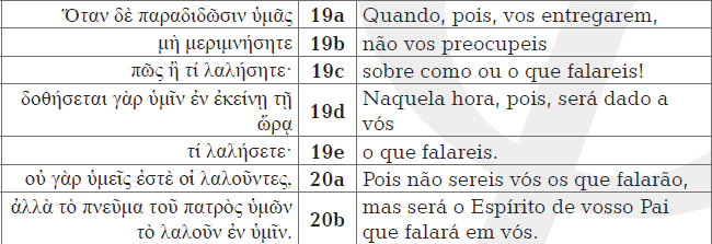 No Evangelho segundo Mateus, de forma semelhante, amesma ideia parece estar presente. Em seu discurso dirigido aos«doze discípulos» (Mt 10,1), Jesus avisa estes últimos sobre futurasperseguições (Mt 10,16-20). Por serem «enviados como ovelhas emmeio a lobos», hão de «ser prudentes como as serpentes e simplescomo as pombas» (Mt 10,16). Mesmo assim, serão «entregues aostribunais, flagelados nas sinagogas e levados diante de governadorese reis» (Mt 10,17-18). Enfim, é de maior interesse para esta pesquisao que irá acontecer com os discípulos quando precisarão falar emtais situações. Eis uma tradução literal do que se ouve ou se lê emMt 10,19-20: