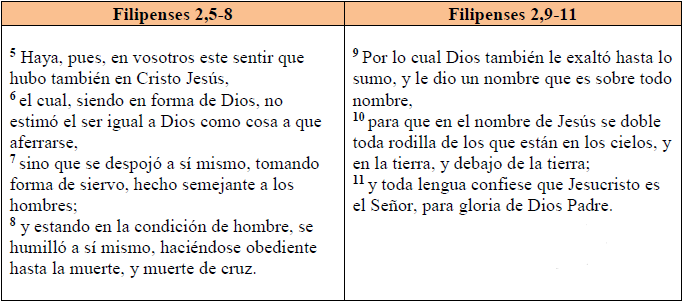 Este himno, desde la perspectiva trinitaria, se ha asumido como autodonación y se ha asociado a la humillación y sufrimiento de Cristo17. Es el himno más exaltado del Nuevo Testamento. Algunos autores piensan que la kénosis tiene que ver con la encarnación, con el abajamiento del logos. Se caracteriza por un primer movimiento el descenso de la forma de Dios a la forma de esclavo Flp 2,5-8. Posteriormente, el movimiento de ascenso donde Dios es el sujeto que exalta la obra de Jesús Cristo Flp 2,9-11.
