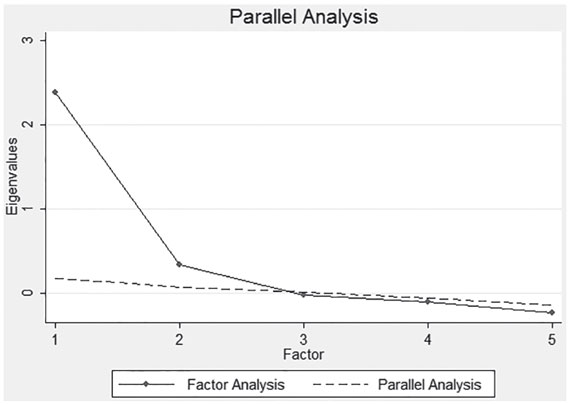 El AFC arrojó como resultado los siguientes índices de ajuste: χ2=702,960; gl=10, p-valor=0.001; RCEMA=0.155 (IC90%: 0.107-0.209); ICA=0.961; ITL=0.922 y no se detectaron índices de modificación. La Figura 1 sugirió retener un solo factor como respuesta a la estructura factorial de la escala; allí se muestra solo uno de los valores propios por encima del punto de inflexión de la línea del número de factores desde donde esta se vuelve estable.