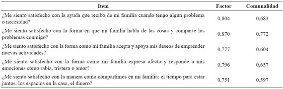 Resultados: El promedio global del APGAR familiar fue 17,07±3,15 y la prevalencia de disfunción familiar fue 44,4 % (IC 95%: 38 - 51 %). La consistencia interna fue 0,90. El AFE reportó un solo factor que explicó el 64,1 % de la varianza total. El AFC mostró como índices de ajuste χ2=702,960; gl=10, p-valor=0.001; RCEMA=0.155 (IC90%: 0.107-0.209); ICA=0.961; ITL=0.922.
