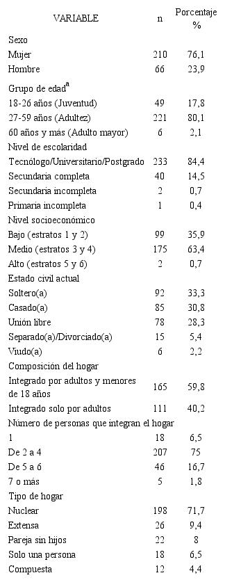 Del total de la muestra de adultos trabajadores de la Caja de compensación residentes en la ciudad de Villavicencio para el primer trimestre del año 2017, por cada tres mujeres había un hombre. La mitad de los participantes incluidos en la muestra tenían 35 años cumplidos o menos (Rango intercuartílico RIC = 28,7-41,8). De cada cinco personas incluidas en el estudio cuatro cursaron carreras técnicas y/o universitarias. El nivel socioeconómico medio fue más prevalente en los hombres (66,7%). El estado civil más prevalente en las mujeres fue ser soltera (31,9%). Los hogares unipersonales tuvieron una prevalencia considerablemente más alta en hombres (12,1%) que en mujeres (4,8%) Tabla 1.