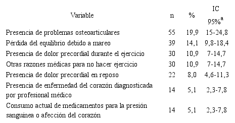 La barrera de salud física más prevalente reportada en ambos sexos fue la presencia de dolor osteoarticular (hombres 13,6%, mujeres 21,9%). En el grupo de edad de 18 a 26 años la principal barrera fue el dolor precordial al hacer actividad física (26,7%) y en los participantes de 27 a 59 años fue la presencia de otro tipo de razones médicas para no realizar actividad física (86,7%) Tabla 2.