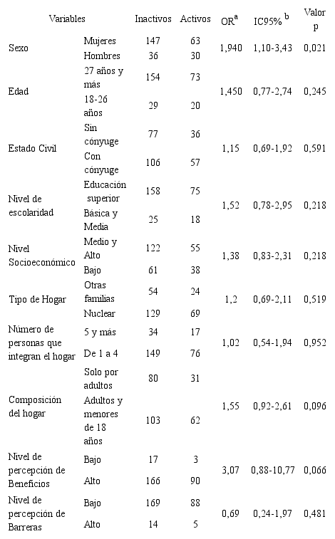 En esta investigación se encontró que las mujeres de la muestra tuvieron una mayor oportunidad de ser inactivas físicamente en comparación con sus compañeros del sexo opuesto cuando se ajustó por edad y nivel de percepción de beneficios. Gómez, et al3 reportaron similares resultados al demostrar que los hombres presentaban una mayor oportunidad de realizar actividad física (OR = 1,62 IC 95% 1,31-2,01) cuando se ajustó por varios factores de confusión, entre ellos la edad, el estado civil y el nivel educativo. De la misma manera, Zafra, et al35 encontraron mayores niveles de sedentarismo en mujeres (OR = 2,13 IC 95% 2,03-2,23). Meseguer, et al36 reportaron una mayor oportunidad de realizar actividad física en los hombres al ajustarse por las variables de edad, nivel de escolaridad e índice de masa corporal (OR = 2,41 IC 95%: 2,20-2,64).