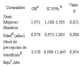 La Tabla 3 mostró que la oportunidad de ser inactivo físicamente en las mujeres fue aproximadamente dos veces la oportunidad de ser inactivo en los hombres de la muestra estudiada (OR = 1,940, IC95%: 1,10-3,43). Dicha asociación se mantuvo al ajustar por las variables de edad y nivel de percepción de beneficios Tabla 4. Para las demás variables sociodemográficas no se encontraron asociaciones significativas con respecto al nivel de actividad física practicada.