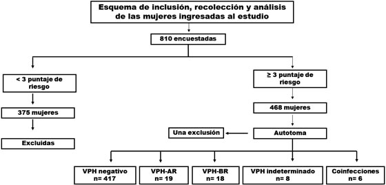 Un total de 810 mujeres ingresaron en el estudio según los criterios de inclusión. De estas, 375 tuvieron un puntaje de riesgo según la encuesta epidemiológica menor de tres, por lo que su participación terminó en este punto. Las otras 435 mujeres fueron clasificadas como moderado/alto riesgo de CCU porque presentaron ≥ 3 puntos y procedieron a la autotoma. Se excluyó una mujer que al momento de la toma de muestra presentó abundante sangrado y se rehusó a repetir la autotoma por lo cual, no pudo determinarse el resultado. Figura 1.