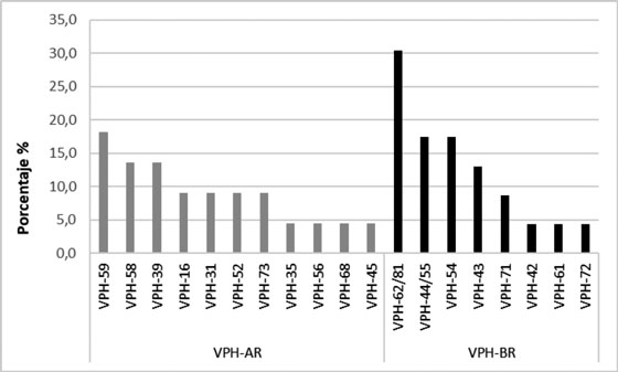 Se encontraron seis casos de coinfecciones tanto de VPH-AR/VPH-BR como de VPH-BR/VPH-BR. El genotipo VPH-AR-39 se presentó en dos coinfecciones. El genotipo VPH-16 estuvo relacionado en un caso de coinfección a pesar de no ser frecuente en la población analizada (n=2). Por otra parte, hubo una mujer VIH positiva quien presentó coinfección con tres genotipos (un VPH-AR y dos VPH-BR), y otra de las seis pacientes coinfectadas manifestó no haberse realizado una citología en su vida.