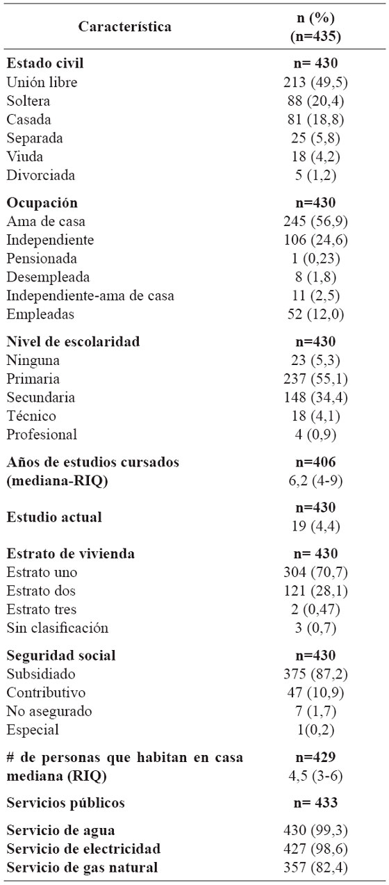 La mediana de edad del grupo de mujeres con moderado o alto riesgo fue de 46,4 años, la mayoría vive en unión libre, son amas de casa y asistieron solo a la primaria. Alrededor del 50% cursó 6,2 años de estudios, el 70,7% vive en estrato uno y el 87,2% pertenece al régimen de seguridad social subsidiado. Los principales servicios públicos están presentes en la mayoría de las viviendas de este grupo de mujeres. Tabla 1.