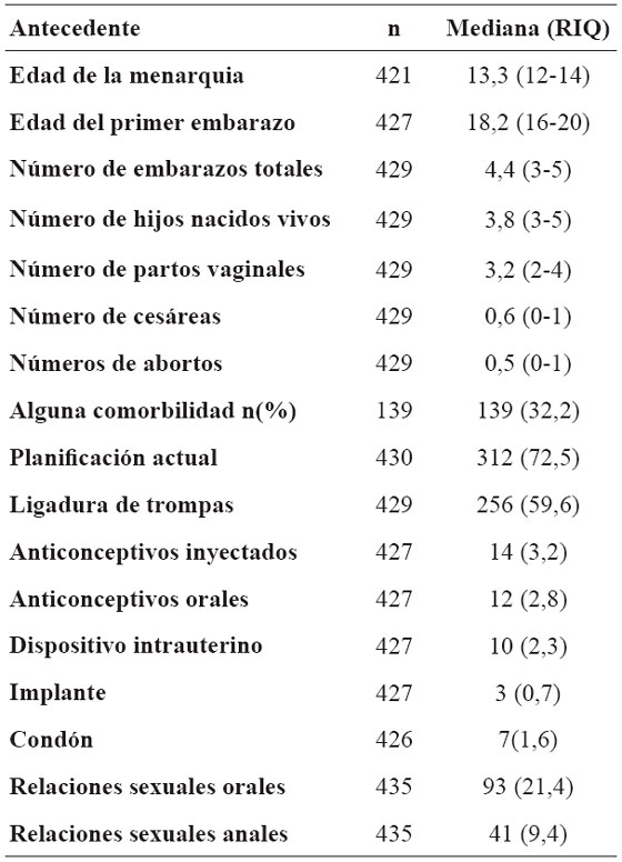 En el historial ginecológico de las mujeres de riesgo se encontró que el 50% tuvo su primera menstruación a los 13 años; la mediana de edad del primer embarazo fue a los 18 y de embarazos totales fue cuatro. De todas las mujeres que se practicaron autotoma, actualmente la mayoría planifican por medio de ligadura de trompas y en menor porcentaje con anticonceptivos inyectados y orales. Por otra parte, solo el 21,4% manifestó tener prácticas sexuales orales y el 9,4% relaciones sexuales anales. Tabla 2.