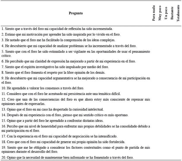 Se escogió el instrumento creado y validado por Andrei Fedorov17 en el año 2008 (Anexo 1) ya que mide las variables de interés como son las habilidades actitudinales, cognitivas, autorreguladoras y metacognitivas. Este ya ha sido utilizado en Chile en otras investigaciones para la evaluación de foros12, por lo que no fue necesaria una nueva validación y adaptación.