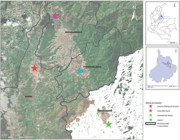 La selección de las áreas donde se realizaron las colectas fue determinada de acuerdo con el historial de casos de dengue reportados en el área metropolitana de Bucaramanga y por sugerencia de funcionarios de la Secretaria de Salud de Santander (datos no publicados). Luego de que se confirmó que varias localidades presentaban registros de Dengue se procedió a socializar el proyecto con los líderes las juntas de los barrios Hacienda San Miguel (Piedecuesta), Alicante (Girón), Lagos 2 (Floridablanca) y la Comuna Norte el barrio Divino Niño (Bucaramanga), del área metropolitana de Bucaramanga.