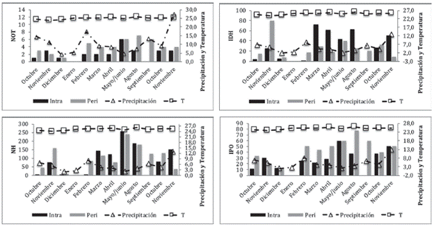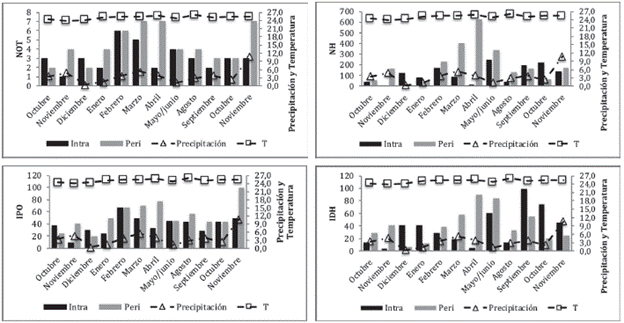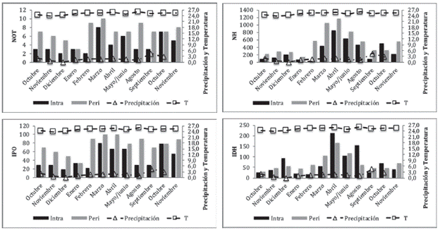Para el municipio de Floridablanca el índice de oviposición fue mayor en el peridomicilio para IPO. El número de ovitrampas positivas y los índices más altos de oviposición se presentaron en marzo, abril y noviembre (NOP-peridomicilio), noviembre (IPO-peridomicilio). Sin embargo, para NH fue en abril para peridomicilio, pero para IDH se presentó el más alto índice en septiembre para intradomicilio (Figura 4).