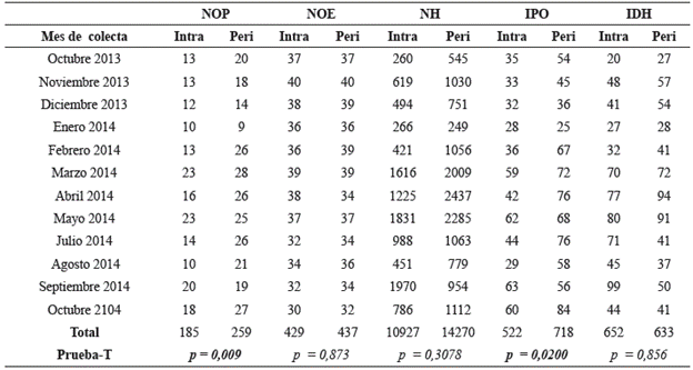 Durante el estudio se detectó A. aegypti en todos los lugares de muestreo del área metropolitana de Bucaramanga. Se recolectaron 25.254 huevos que corresponden a 39,1% en Girón, 36,8% en Bucaramanga, 15,2% Floridablanca y 8,9% en Piedecuesta. Se observó también el número de ovitrampas y los índices de oviposición en general, en el peridomicilio fueron mayor que en el intradomicilio siendo esto estadísticamente significativo para NOE e IPO. Sin embargo, los índices no permitieron detectar un patrón de comportamiento que indiquen los meses de mayor y menor porcentaje de ovoposición (Tabla 1).