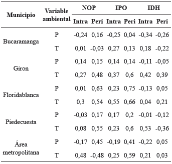 En cuanto al análisis de correlación entre los índices de oviposición con las variables Precipitación (P) y Temperatura (T°) se detectó que el área metropolitana se correlacionó en menor medida con las variables de precipitación y temperatura que cuando se comparó individualmente cuando se hizo la comparación con los municipios. En este sentido, el análisis de los municipios evidenció correlaciones positivas (> 0,5) en NOP, NH e IPO en peridomicilio y IPO y IDH en intradomicilio. De cualquier forma, en Floridablanca fueron evidentes las correlaciones positivas en peridomicilio entre el índice IPO con la precipitación y la temperatura (Tabla 2).