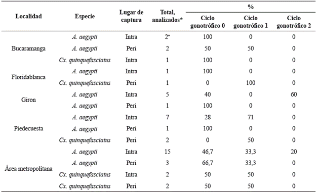 Se realizó el estado gonotrófico de las hembras colectadas en el área metropolitana en el muestreo activo para un total de 18 hembras de A. aegypti y cuatro hembras de Culex quinquefasciatus. Para A. aegypti se determinó que en intradomicilio el 46,7% de las hembras no presentan actividad hematofágica, 33,3% presentan un único ciclo gonotrófico y 20% acusaron dos ciclos gonotróficos. En peridomicilio 66,7% de las hembras no presentan actividad hematofágica y 33,3% presentan un único ciclo gonotrófico siendo Girón la localidad con los mosquitos más activos, ya que de seis hembras colectadas cuatro presentaron actividad hematofágica de dos ciclos gonotrófico. Para Cx. quinquefasciatus se determinó que en el intradomicilio 50% de las hembras no presentaron actividad hematofágica y el otro 50% presentó un único ciclo gonotrófico (Tabla 3).
