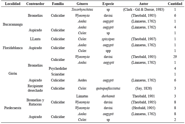 Paralelamente durante la instalación de las ovitrampas se realizaron muestreos activos en bromelias, principalmente de los géneros Guzmania sp (Piedecuesta), Tillamdsia sp (Girón y Bucaramanga) y Neoregelia sp (Piedecuesta), en rutáceas género Dracaena sp (Piedecuesta) y en contenedores de agua residuales de lluvia. Tanto huevos como larvas colectadas fueron llevadas al laboratorio y se mantuvieron hasta la emergencia de los adultos, los ejemplares fueron sacrificados, montados y determinados taxonómicamente.