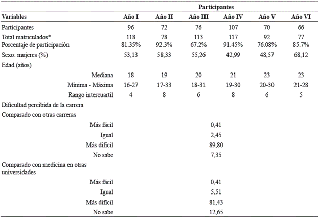 En la encuesta participaron 490 estudiantes; en la Tabla 1 se encuentra la proporción de participantes por año de estudio. En comparación con el número de matriculados, la participación puede considerarse aceptable (490), correspondiendo al 82.35% del total de estudiantes matriculados (595). Como se puede apreciar en la Tabla 1, la mayor participación estuvo en cuarto año y la menor en tercer año, lo cual puede responder a la disponibilidad de estar en el momento de recolección de datos. Tanto el sexo como la edad de los participantes sugieren que hubo una buena representación de los estudiantes. La percepción inicial es que estudiar medicina en la UIS es más difícil que otras carreras, y más difícil que en otras universidades.