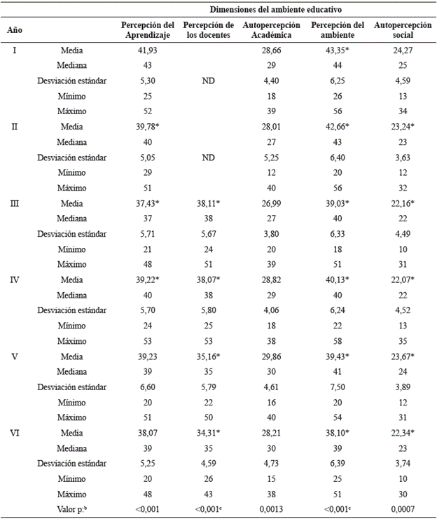 En la Tabla 2 se encuentran los puntajes obtenidos en las dimensiones del ambiente educativo. Un primer hallazgo es que los estudiantes de los dos primeros años no quisieron brindar información sobre los docentes. Todos los puntajes estuvieron por encima del valor intermedio, sin sobrepasar el 75% del valor máximo posible, lo que puede interpretarse como una percepción aceptable de los ambientes educativos. Sin embargo, resultó muy llamativo que entre los 6 años de estudio se observaran diferencias significativas en todas las dimensiones; la tendencia en las dimensiones de percepción de los docentes y del ambiente educativo, es que los valores más altos se observan en los primeros años y éstos van disminuyendo con el avance de la carrera. También resalta que los valores más bajos en las dimensiones de percepción de aprendizaje y autopercepción académica se observan en tercer año, y lo mismo sucede en sexto año en las dimensiones de percepción de los docentes y del ambiente.
