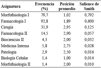 Listados libres. Para identificar las asignaturas consideradas como más difíciles y las que más eran reprobadas, se pidió que los estudiantes las listaran. Para su análisis se usó la técnica de listados libres, con el que se obtiene un valor de Salience de Smith entre cero y uno, que en su construcción considera la frecuencia con que aparece cada respuesta y la posición relativa en la que es listada cada respuesta[9]. A mayor valor es más relevante la respuesta dentro del conjunto de asignaturas de pregrado de medicina. Este análisis se hizo con el software Anthropac 4.983[10].