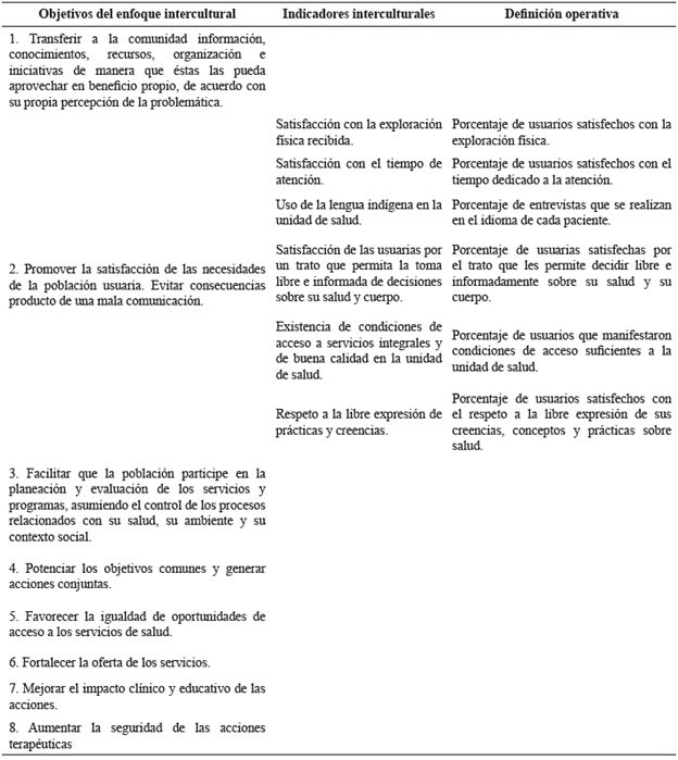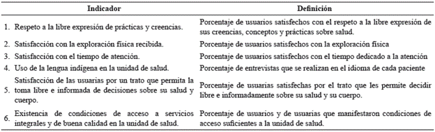 La organización de los indicadores propuestos para su evaluación, tuvieron sustento en un proceso de consulta en comunidades indígenas. La Secretaría de Salud seleccionó 10 indicadores y otros a partir de una propuesta de indicadores en interculturalidad, para finalmente tener una lista de seis indicadores que se describen a continuación: