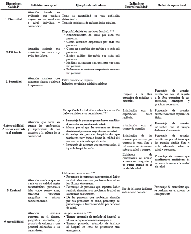 Dado este contexto, se realizó un comparativo de acuerdo a las dimensiones que integran el concepto de Calidad (OMS), con los indicadores propuestos para la interculturalidad en salud y también, con algunos ejemplos de indicadores que son utilizados en el área de salud, algunos utilizados por el Consejo Nacional de Evaluación de la Política de Desarrollo Social (CONEVAL)[35].