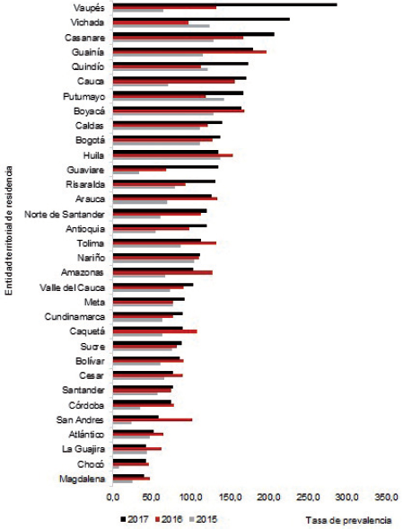 Por entidad territorial de residencia para 2017 la mayor tasa de prevalencia por 10.000 nacidos vivos se encontró en Vaupés (286,7), Vichada (226,4), Casanare (206, 5), Guarnía (180,1) y Quindío (174,3). Mientras que las menores tasas se encontraron en los departamentos de Magdalena y Chocó (para los tres años en estudio), y en La Guajira, Atlántico y San Andres (para dos de los tres años en estudio) con tasas inferiores a 60 casos por 10.000 nacidos (Gráfica 1).
