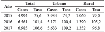 La notificación de defectos congénitos en Colombia ha aumentado un 39,9% entre 2015 y 2017, pasando de 4.994 a 6.985 casos. Así mismo, la tasa de prevalencia por 10.000 nacimientos pasó de 75,6 a 106,6. Por área de residencia, se encontró una notificación de casos más alta en los hijos de madres residentes en las áreas urbanas, cuatro veces mayor en promedio, comparado con los hijos de madres residentes en áreas rurales, siendo también más alta la tasa de prevalencia en el área urbana en el último año en estudio (Tabla 1).