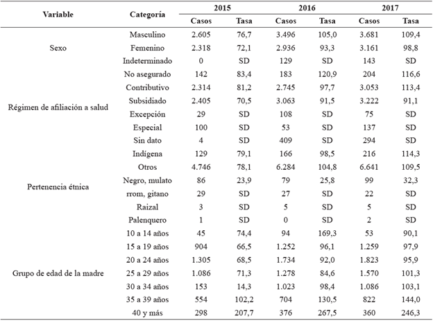 Con relación a las variables demográficas y sociales se encontró una mayor notificación de casos y tasa de prevalencia en el sexo masculino. Con respecto al régimen de afiliación a salud las tasas más altas se reportan en la población no asegurada seguida de la población del régimen subsidiado. Por pertenencia étnica la mayor tasa de prevalencia, en 2015 y 2017, se reportó en población indígena. Finalmente, por grupo de edad de la madre se observó que la mayor proporción de defectos congénitos se notificó en hijos de madres entre los 20 y 29 años, pero la tasa de prevalencia más alta se encontró en mujeres de 35 y más años, con tasas de hasta 267,5 casos por cada 10.000 nacidos en mujeres de 40 y más años (Tabla 2).