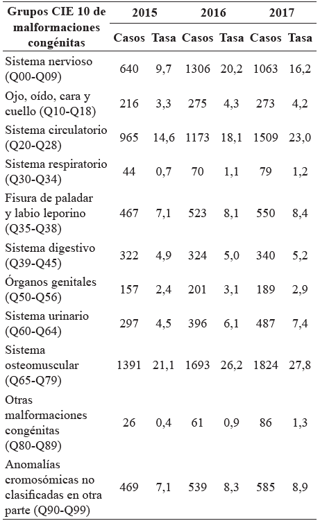 Analysis of congenital defects in Colombia from 2015 to 2017