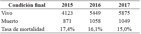 De acuerdo con la condición final el 83,2% de los casos fueron notificados con condición final vivo. La tasa de mortalidad ha presentado una disminución en los tres años en estudio, pasando de 17,4% en 2015 a 15,0% en 2017 (Tabla 4).