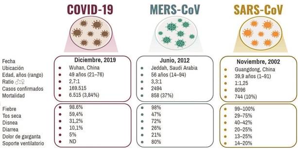 En las últimas dos décadas, el coronavirus causante del síndrome respiratorio agudo severo (SARS-CoV) y el coronavirus del síndrome respiratorio del Medio Oriente (MERS-CoV) provocaron dos epidemias que acumularon cerca de 10.000 casos 9),(10. En el caso del SARS-CoV, la epidemia duró siete meses, se detectó en 29 países, ocasionó más de 8.000 casos y tuvo una tasa de mortalidad del 10%. Por otro lado, el MERS-CoV sigue transmitiéndose en pequeños brotes desde el 2012, y ha sido detectado en 27 países, reportándose cerca de 2.500 casos, con una mortalidad del 37%9,(10. Actualmente, el COVID-19 en tres meses ha infectado cerca de 170.000 personas y se encuentra en 157 países de los cinco continentes, causando hasta ahora más de 6500 muertes, demostrando una alta transmisibilidad de persona a persona que involucra infecciones a trabajadores de la salud y, por tanto, un mayor riesgo de propagación del virus (11.