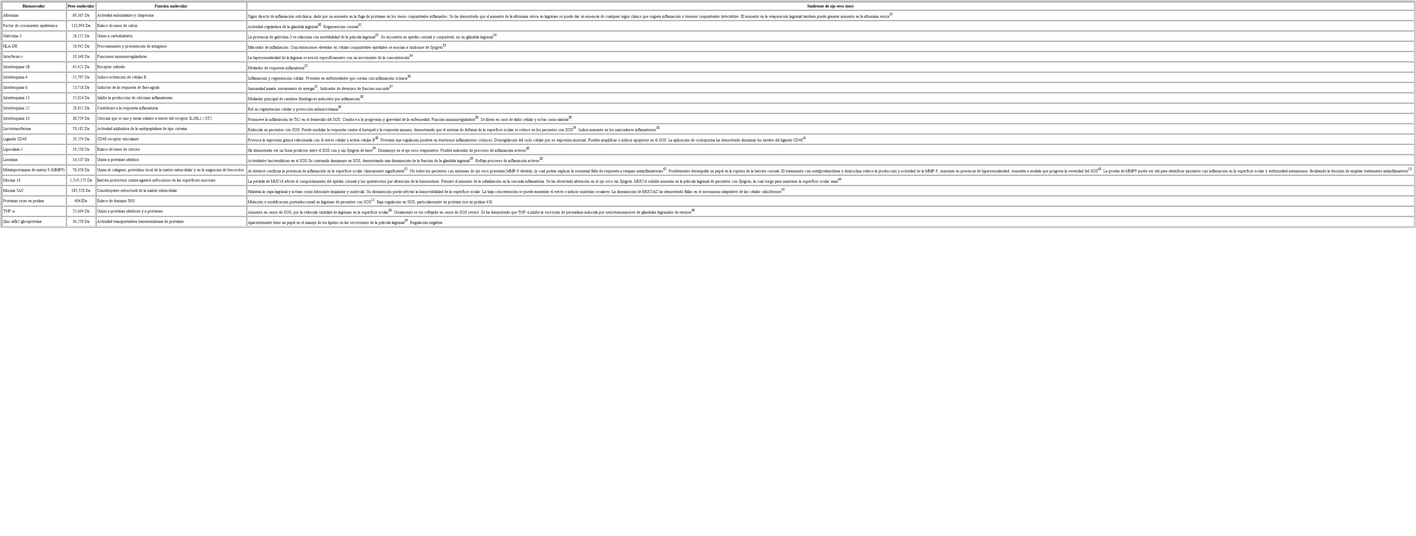 Con base en la evidencia encontrada se construyó la siguiente tabla, la cual reúne el nombre del biomarcador, su peso molecular, función molecular y los principales aportes clínicos en relación con el diagnóstico del síndrome de ojo seco.
