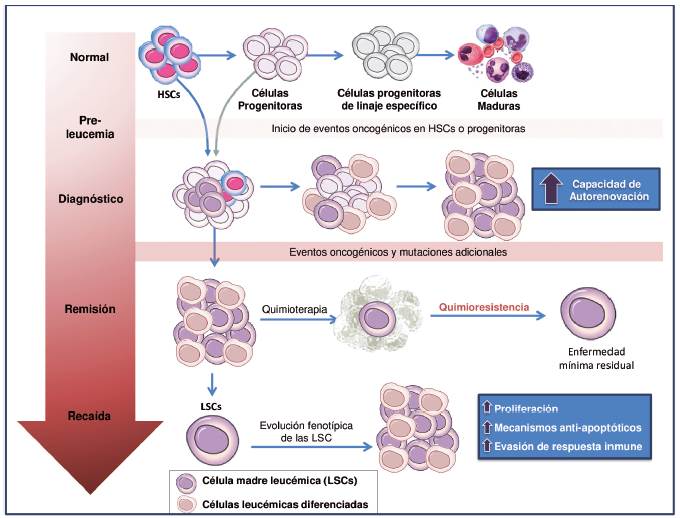 Las células madre hematopoyéticas (HSC) dan lugar a células progenitoras, células progenitoras comprometidas con linajes hematopoyéticos específicos y finalmente a células diferenciadas maduras. Los eventos oncogénicos en HSC o células progenitoras producen una población de células madre con autorenovación aberrante lo cual resulta en una lesión preleucémica que progresa a una transformación maligna. En el momento del diagnóstico, el tumor heterogéneo contiene tanto células normales como células madre leucémicas (LSC) que tienen la capacidad de auto renovarse y de dar origen a células leucémicas diferenciadas. A medida que la enfermedad progresa, la infiltración leucémica es mayor. Las mutaciones adicionales permiten que las LSC adquieran un fenotipo resistente mediante el aumento de las vías de señalización de proliferación, el aumento de los mecanismos antiapoptóticos y la evasión de la respuesta inmune. Después del tratamiento quimioterapéutico, las LSC pueden evadir la muerte y sobrevivir a las terapias gracias a las propiedades adquiridas, lo que finalmente lleva al paciente a la recaída de la enfermedad.