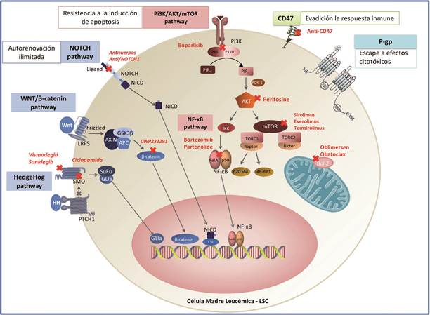 Diagrama de una Célula Madre Leucémica con expresión de diferentes moléculas de superficie como CD44, CXCR4, CD117, VLA-4, TIE-2, CD33, CD123 y activación de vías de señalización que confieren capacidad de resistencia tras ocurrir las mutaciones y eventos leucemogénicos. Las vías de señalización que aumentan la supervivencia como PI3K/AKT y NFκB, pueden activarse en LSCs por diversos estimulos como citokinas, factores de crecimiento y quimiocinas. El potencial de autorrenovación es inducido por la activación de otras vías como HedgeHog, Wnt/Bcatenina y NOTCH1. La sobreexpresión de proteínas antiapoptóticas de la familia Bcl-2 como Bcl-2, Bcl-xl, Bcl-w y Mcl-1 induce la resistencia celular al estrés provocado por apoptosis y disminuyen la acción de proteínas pro-apoptóticas como Bad, Bax y Bim. Las estrategias para la erradicacion selectiva de las LSCs (marcadas en rojo) incluyen antagonistas de citoquinas y quimiocinas, anticuerpos monoclonales dirigidos contra marcadores de superficie expresados por las LSCs y moléculas inhibidoras de diversos componentes de las vías de señalización implicadas en autorrenovación, supervivencia, evasión de apoptosis y metabolismo tumoral.