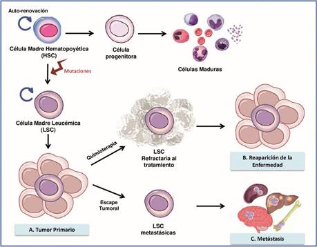 Debido a que las células madre leucémicas posee un rol decisivo en la formación, desarrollo y crecimiento de la leucemia, esta población celular se ha planteado como posible responsable de la recurrencia de la enfermedad y la resistencia a la quimioterapia convencional observada en gran número de pacientes. Esto ha estimulado el estudio de nuevas estrategias para el desarrollo de terapias contra el cáncer, ya que estas células juegan un papel fundamental en al menos tres diferentes contextos de la progresión del cáncer: 1) Durante la formación del tumor primario, en donde mutaciones en una célula madre normal pueden dar origen a una LSC que a su vez da origen al tumor; 2) durante la recaída de la enfermedad, dado que el tratamiento con quimioterapia destruye la mayoría de las células del tumor primario, pero las LSCs son resistentes a la terapia y el tumor crece de nuevo; 3) y finalmente durante la propagación, ya que las CSCs derivadas del tumor primario pueden migrar a sitios distantes y originar metástasis44 (Figura 3).