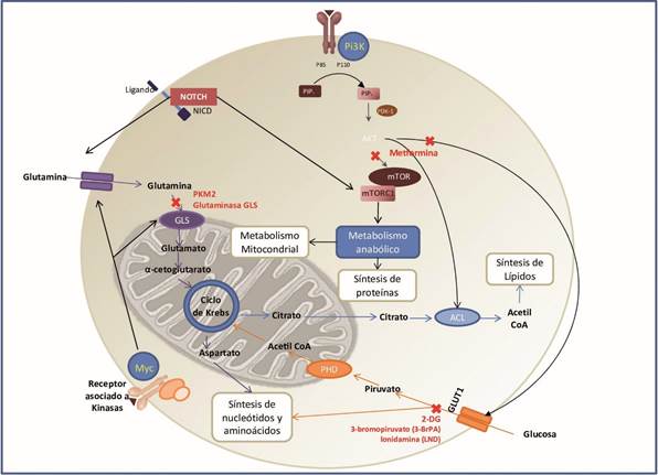 Hoy se sabe que muchos estímulos oncogénicos afectan los circuitos metabólicos que promueven el metabolismo de Warburg. Entre estos se encuentra la vía de señalización Notch, que se haya sobre expresada en la mayoría de las leucemias linfoblásticas agudas de células T humanas (T-cell acute lymphoblastic leukaemia, T-ALL por sus siglas en ingles), generalmente como resultado de mutaciones en NOTCH1 59, y se ha visto que promueve el metabolismo glicolítico 60. Trabajos complementarios en esta línea demuestran que Notch además promueve el metabolismo oxidativo; al respecto, Herranz, et al. observaron que la inhibición farmacológica o la ablación genética de la señalización de Notch en modelos murinos xenotransplantados con T-ALL humana primaria, se traducía en un incremento dramático de los niveles de glutamina, mientras que la expresión de enzimas que normalmente aumentan la glutaminólisis (por ejemplo, la isoforma M2 de la piruvato quinasa PKM2 y la glutaminasa GLS) rescataban a los linfoblastos de la inhibición de Notch. Estos resultados demuestran que las T-ALL con mutaciones activadoras de NOTCH1 usan la glutamina como principal fuente de intermedios del ciclo TCA (proceso conocido como anaplerosis), en otras palabras, que Notch influye en el metabolismo intermediario de las células de T-ALL. Por otro lado, Herranz, et al. observaron que la inhibición de la señalización de NOTCH1 de la mano con la inhibición de la glutaminólisis conllevaba a un bloqueo metabólico, el cual desencadenaba un proceso de autofagia en las células leucémicas. Es decir que, el empleo de inhibidores de la glutaminolisis potenciaba de manera fuerte y sinérgica los efectos antileucémicos de la terapia anti-NOTCH1 en este modelo murino de T-ALL. Estos hallazgos validan el empleo de estrategias terapéuticas enfocadas en bloquear rutas que promueven el metabolismo de Warburg en esta enfermedad61. El vínculo entre Notch y el metabolismo de la glutamina en T-ALL está en línea con el trabajo previo de Palomero y col que evidencia como un objetivo crítico posterior de NOTCH1 en este contexto celular es MYC, un regulador clave de la glutaminólisis 62), (63.