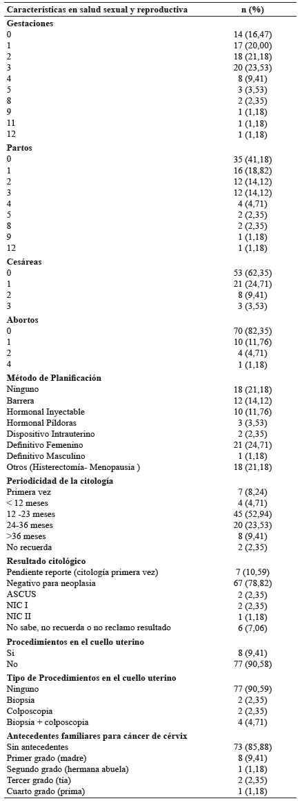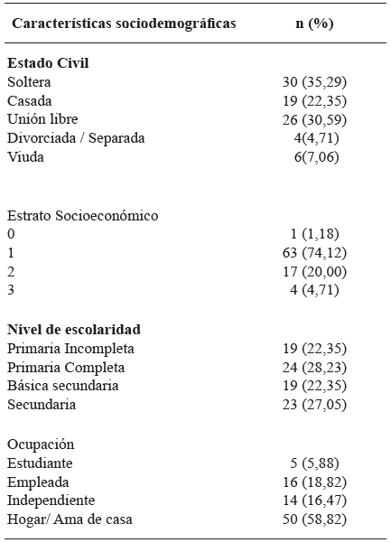 En la caracterización de las 85 participantes, se puede resaltar que la mediana de edad fue de 39,5 años, con una edad mínima de 15 años y una máxima de 71 años; el 35,29% de ella eran solteras y el 39,59% vivían en unión libre; el 74,12% las participantes se ubicaban en el estrato socioeconómico I; la mediana de años de escolaridad fue de 6,5 años cursados y aprobados, con un mínimo de 1 y máximo de 13 años; en el 58,82% su ocupación era el hogar/ama de casa y el 100% se encontraban afiliadas al régimen subsidiado en salud.