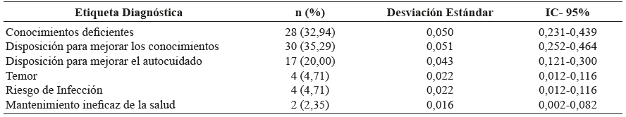 Los Diagnósticos de enfermería más prevalentes correspondieron al Dominio de Cognición y percepción, específicamente Disposición para mejorar los conocimientos y Conocimientos deficientes; seguido del dominio de Actividad y Reposo, con el diagnóstico Disposición para mejorar el autocuidado; en el dominio de Promoción de la Salud se identificó el diagnóstico de Mantenimiento ineficaz de la salud; en el dominio de Afrontamiento y tolerancia al estrés con el diagnóstico de Temor y finalmente en el dominio de Seguridad y Protección el diagnóstico de Riesgo de infección.