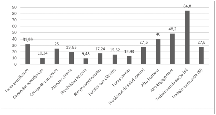 En principio, se identificó que la frecuencia de los factores psicosociales positivos fue superior a los negativos en la muestra de comerciantes informales participantes, donde destacan las “tarea gratificante” (31,99%), “compartir con gente” (25%), “atender al cliente” (19,83%), y los efectos psicológicos positivos de engagement (48,2%) y una alta frecuencia de “trabajo satisfactorio” (84,8%). Mientras en los factores negativos solo 3 categorías alcanzaron a estar presentes, específicamente los “riesgos ambientales” (17,24%), “batallar con clientes” (15,52%) y “pocas ventas” (12,93%) como factores estresantes (Figura 1).