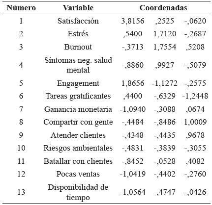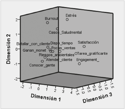 Finalmente, el análisis de escalamiento multidimensional permitió identificar un modelo con buen ajuste para la determinación de las distancias entre las variables bajo estudio (S-Stress=,07731, RSQ=,97006), el cual presentó 3 posibles dimensiones subyacentes e interpretables: 1) dimensión de motivación extrínsecaintrínseca, donde se ubicaron coordenadas antagónicasextremas tales como satisfacción, engagement y tareas gratificantes por un lado (coordenadas ,3,8, ,1,86 y ,44, respectivamente), y por otro, ganancias monetarias, pocas ventas y disposición de tiempo (coordenadas -1,09, -1,04 y -1,05 respectivamente), 2) dimensión de aspectos positivos y negativos, donde las coordenadas fueron desde burnout y estrés (coordenadas 1,75 y 1,71 respectivamente) a engagement y conocer gente (coordenadas -1,12 y -,84 respectivamente); y 3) la dimensión de interacción hacia el trabajo vs las personas, donde fueron antagónicas tarea gratificante (coordenadas -1,24) en un extremo, y compartir con gente (coordenadas 1,00) en el otro extremo (Tabla 2).