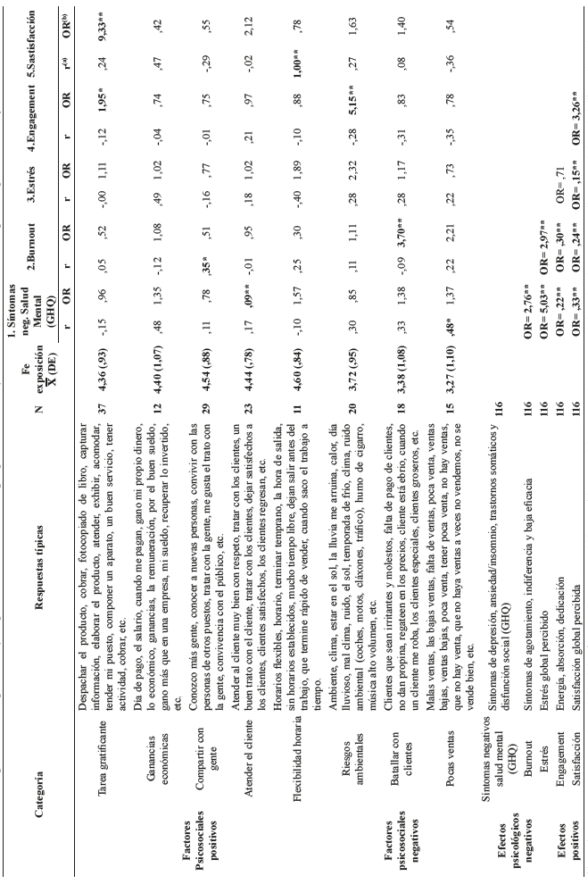 El análisis de relación entre variables categóricas (en la muestra total) reveló pocas asociaciones estadísticamente significativas y con magnitudes de efecto importantes, entre ellas se encontró que las “tarea gratificante” se asoció positivamente con la satisfacción laboral (OR=9,33, p<,05) y con el engagement (1,95, p><,10), “batallar con clientes” también positivamente con el burnout (OR=3,70, p><,05), mientras que “atender a clientes” fue factor protector para los síntomas de salud mental (OR=,09, p><,05), todas estas relaciones esperadas teóricamente. Sin embargo, destacó la relación positiva inesperada de los “riesgos ambientales” y el engagement (OR=5,15, p><,05). Por otro lado, las correlaciones entre las frecuencias de las ><,05) y con el engagement (1,95, p<,10), “batallar con clientes” también positivamente con el burnout (OR=3,70, p<,05), mientras que “atender a clientes” fue factor protector para los síntomas de salud mental (OR=,09, p<,05) , todas estas relaciones esperadas teóricamente. Sin embargo, destacó la relación positiva inesperada de los “riesgos ambientales” y el engagement (OR=5,15, p<,05). Por otro lado, las correlaciones entre las frecuencias de las categorías obtenidas y los efectos psicológicos, fueron significativas entre “compartir con gente” y el burnout (r=,35, p<,10, n=29), “pocas ventas” y síntomas de salud mental “negativa” (r=,48, p<,05, n=11), esta última confirmada por la tendencia lineal exacta entre las 2 variables en los 11 participantes. Finalmente, las variables que componen el grupo de los efectos psicológicos mantuvieron asociaciones estadísticas significativas entre prácticamente todas ellas, exceptuando engagement y estrés laboral (OR ,71, p=ns), siendo la relación más alta entre estrés laboral y sintomatología negativa de salud mental, en la dirección esperada (OR=5,03, p<,05) (Tabla 1).