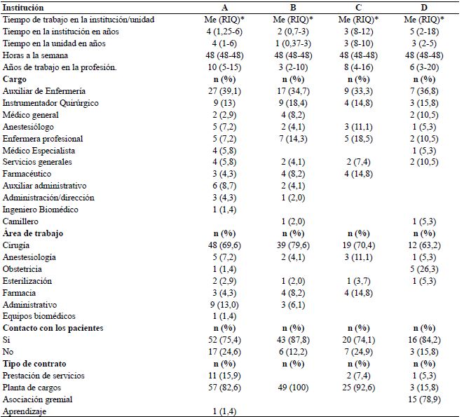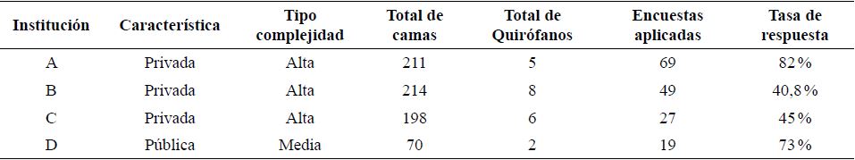 Tres instituciones eran de carácter privado y una pública. Dos instituciones participantes estaban acreditadas y tres prestan servicios de salud de III nivel de atención. Con una tasa de respuesta del 56,5 % a la encuesta. Las características de las instituciones participantes se presentan en la (Tabla 1).