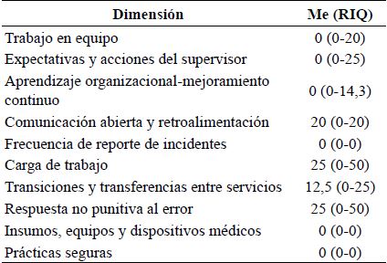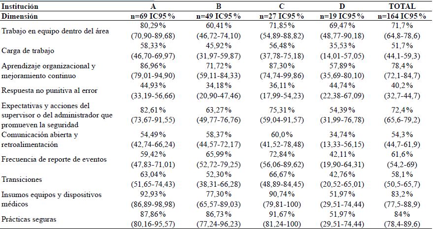 Puntaje de respuestas positivas por dimensión: Entre las instituciones se observaron diferencias en los puntajes para todas las dimensiones evaluadas con porcentaje de respuesta positiva (≥75 %). Las dimensiones con la mayor percepción positiva fueron, prácticas seguras 84 % (IC95 %: 78,4-89,6), insumos, equipos y dispositivos 83,2 % (IC95 %: 77,5-88,9) y aprendizaje organizacional 78,4 % (IC 95 %: 72,1-84,7).