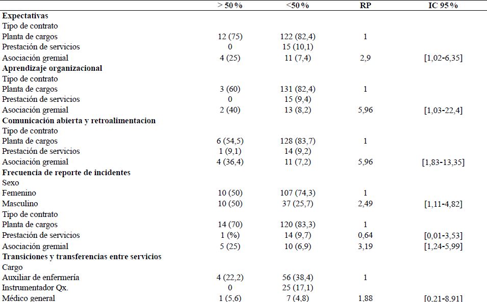 Análisis de asociación: La categoría de asociación gremial tiene mayor percepción negativa en las dimensiones aprendizaje organizacional y mejora-miento continuo (RP: 5,96, IC95 %: 1,03-22,4), expectativas y acciones del supervisor o del administrador que promueven la seguridad (RP: 2,9, IC95 %: 1,02-6,35), comunicación abierta y retroalimentación (RP: 5,96, IC95 %: 1,83-13,35), frecuencia de reporte de eventos (RP: 3.19 IC95 %: 1.24-5.99), transiciones y transferencias entre servicios (RP: 2,44 IC95 %: 0,7-6,16), e insumos, equipos y dispositivos médicos (RP: 2,86, IC95 %: 1,41-3,13); así mismo, en transiciones y transferencias entre servicios se encontró, además, una asociación en la percepción negativa en los colaboradores contratados por prestación de servicios (RP: 3,25 IC95 %: 1.1-6,96). No obstante, cabe resaltar que el 100 % de las personas con tipo de contrato asociación gremial hacen parte de la institución D, que a su vez fue la institución con menor porcentaje de respuestas positivas (Tabla5).