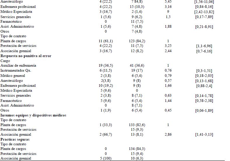 En la dimensión Transiciones y transferencias entre servicios, se encontró asociación de respuestas negativas con el cargo, en las categorías de Médico especialista (RP: 9, IC95 %: 2,42-13,82) y Anestesiología (RP: 5,45, IC95 %: 1,56-11,06), cuando se compara con el personal Auxiliar de enfermería. Para algunas categorías de cargo, no se pudo calcular asociación por la baja cantidad de muestra en la categoría, lo que generó ceros en las casillas de las tablas cruzadas (Tabla5).
