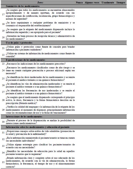 - Evaluación por expertos: el instrumento diseñado fue presentado, revisado y ajustado en diferentes sesiones con la participación de un grupo de profesionales químicos farmacéuticos con experiencia en docencia e investigación en el área farmacéutica asistencial (clínica y comunitaria). Este grupo de profesionales son integrantes activos del grupo de investigación de Promoción y Prevención Farmacéutica de la Universidad de Antioquia (Colombia), y en algunas sesiones habituales del grupo de investigación, se contó con la participación de un médico y de un tecnólogo en regencia de farmacia con experiencia en la dirección técnica de establecimientos farmacéuticos ambulatorios.