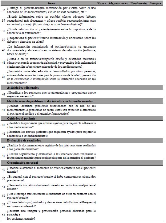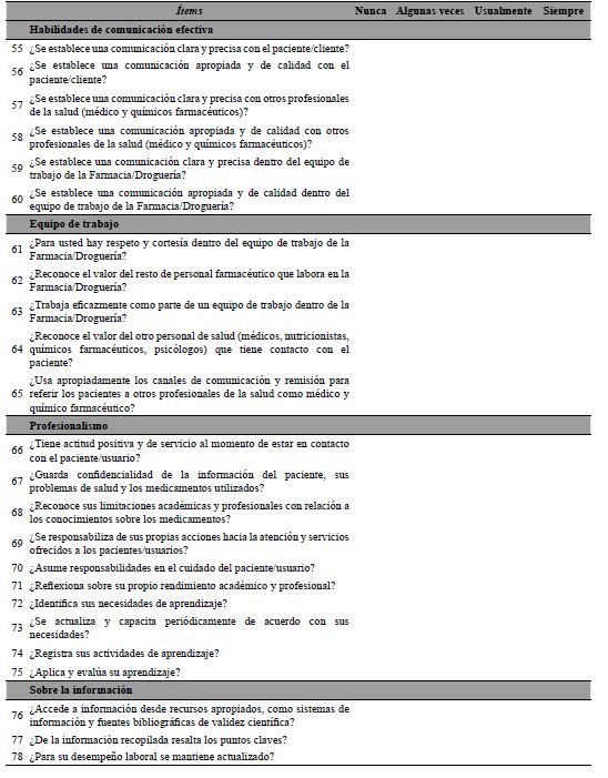 El instrumento construido está distribuido en los siguientes apartados: 1) Información del personal farmacéutico, y 2) Dominios (funciones): a) suministro de cuidados al paciente, b) personales, c) solución de problemas, y d) gestión y organización. Cada uno de estos subgrupos contiene competencias relacionadas entre sí que conforman cada dominio. Cada una de estas competencias tiene una combinación de criterios de desempeño para ser evaluados, de acuerdo con la valoración de la frecuencia en que se realiza, mediante una escala tipo Likert con 4 posibles opciones: 1) Nunca: nunca desempeña o realiza el estándar evaluado, o esta actividad no se encuentra dentro de los procesos del establecimiento farmacéutico; 2) Algunas veces: algunas veces desempeña o realiza el estándar evaluado en sus actividades laborales habituales; 3) Usualmente: usualmente desempeña o realiza el estándar evaluado en sus actividades laborales habituales; 4) Siempre: siempre desempeña o realiza el estándar evaluado en sus actividades laborales habituales. El cuestionario final se describe en la Tabla 4.