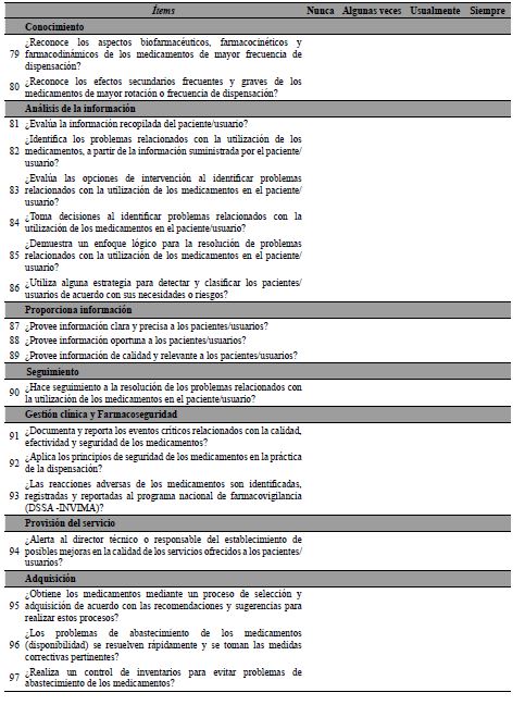 Posteriormente, se revisó la normatividad que regula las competencias laborales del personal farmacéutico en Colombia. Considerando que: 1) una gran proporción de Establecimientos Farmacéuticos ambulatorios, se encuentran dirigidos (amparados) por personal sin formación universitaria profesional o tecnológica (empírico autorizado por el ente de vigilancia y control para el ejercicio de la farmacia -expendedores de medicamentos o director de droguerías-); y 2) la ausencia de un referente normativo que establezca las competencias que debe tener este personal empírico; se estableció que las competencias laborales y sus componentes descritos en la normatividad, específicamente para los Auxiliares de Servicios Farmacéuticos, fueran las mínimas necesarias para la construcción del instrumento de medición. En este sentido, se identificaron 8 competencias laborales, 21 elementos, 181 criterios de desempeño, y 215 conocimientos y comprensiones.