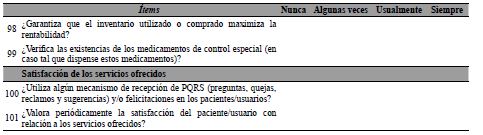 - Prueba piloto: posteriormente, el instrumento se sometió a una prueba piloto con 10 personas de diferentes perfiles y funciones, como personal farmacéutico en servicios y establecimientos farmacéuticos ambulatorios, distribuidos así: 2 servicios farmacéuticos ambulatorios con contratos con aseguradoras dentro del sistema de salud, y 5 droguerías y farmacias-droguerías. Luego de la prueba piloto, las observaciones y sugerencias se presentaron, revisaron y ajustaron en una reunión del grupo de químicos farmacéuticos del grupo de investigación. De forma global, solo hubo observaciones relacionadas con la gramática y la redacción de las preguntas.