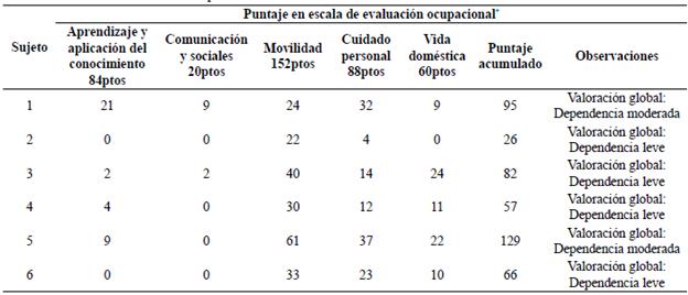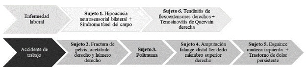 Resultados: La muestra estuvo integrada por seis sujetos, cuatro presentaron un accidente de trabajo y dos, enfermedades laborales. En cuanto a la evaluación del desempeño, se evidenció que el 66 % presentó dependencia leve en actividades específicas; producto de ello, se logró realizar un análisis diferencial con énfasis en la calificación del MUCPCLO. Se reconocen factores específicos en el proceso como la objetividad de la valoración del DO, los múltiples aportes del concepto de DO y las posibilidades de articulación con el manual MUCPCLO.